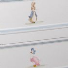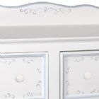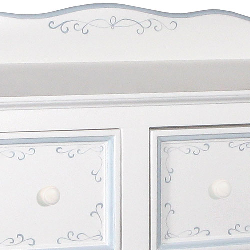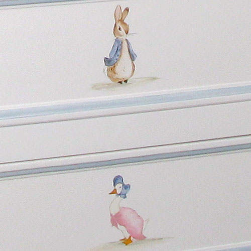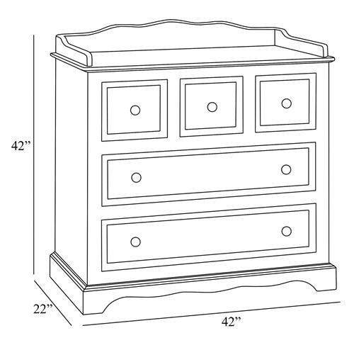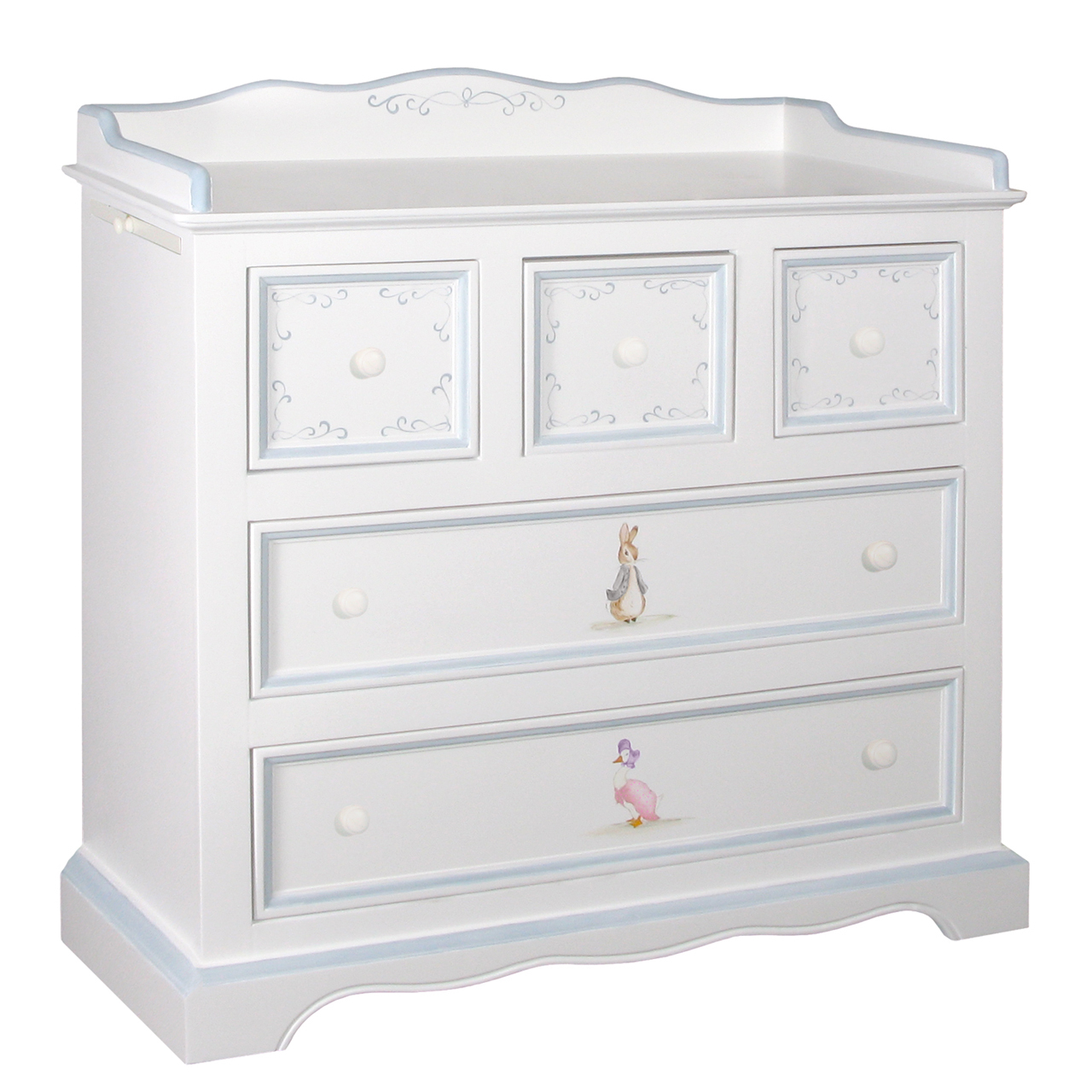 The Vintage Changer is a sweet and charming piece for the nursery, offering five dovetailed, stainless steel glide drawers to store clothing and baby supplies with space on top for a changing pad. Features soft close glides to keep fingers safe. crafted from 100% hard woods. Beautiful handpainted motif depicts a playful bunny and duck. Many coordinating pieces are available.
