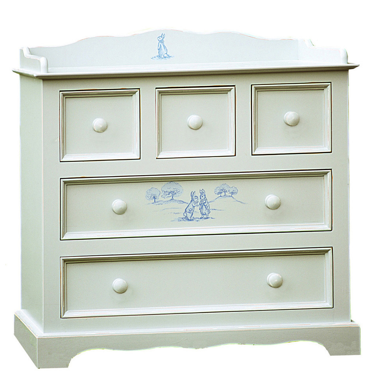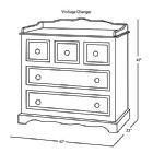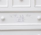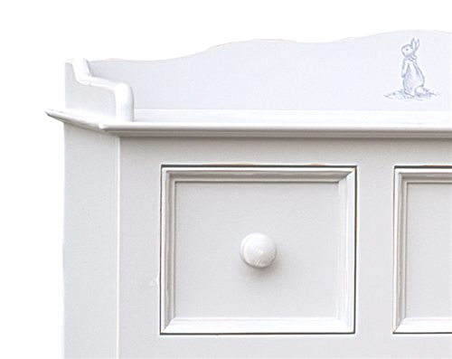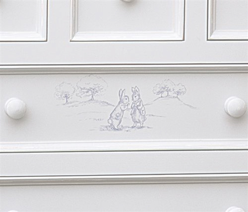 The Vintage Changer is a sweet and charming piece for the nursery, offering five dovetailed, stainless steel glide drawers to store clothing and baby supplies with space on top for a changing pad. Features soft close glides to keep fingers safe. crafted from 100% hard woods. Beautiful handpainted motif depicts a playful bunny and duck. Many coordinating pieces are available.