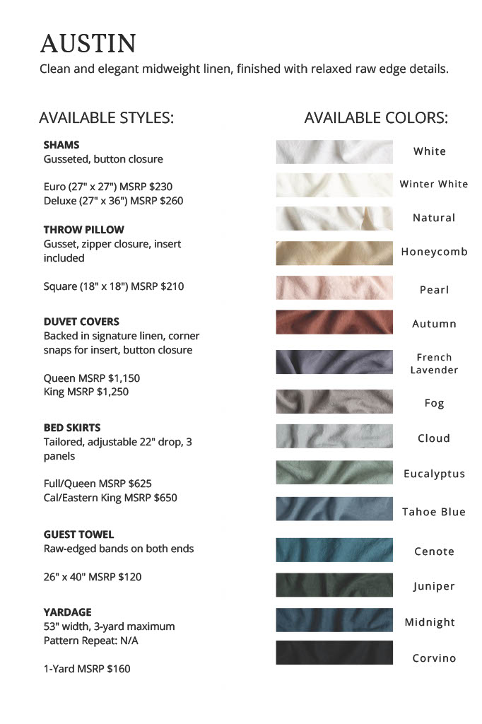 Queen: 90” x 94”, King: 106” x 94”. Midweight Linen, Backed in Signature Linen, Midweight Linen Raw Edge, Button Closure