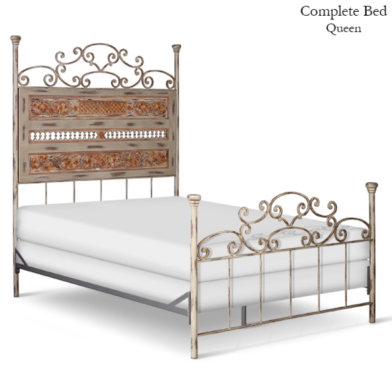 Complete standard metal bed with a decorative headboard panel and scroll accents.