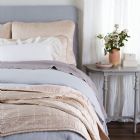 Linen Whisper Shams (Standard) in Winter White, Linen Whisper Duvet Cover (Cloud), and Linen Whisper Bed Skirt in Mineral.