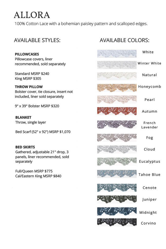 The pillowcase and bolster are lace covers only. See Bria, Linen, Madera Luxe and Paloma for liner options. Inserts are sold separately. Designed and manufactured in California since 1996. Small batch dyed to order, tonal variation will occur