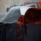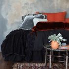Carmen Sham Silk Velvet: 82% Rayon, 18% Silk Euro: 27" x 27", Deluxe: 27" x 36", Silk Velvet with Charmeuse Petite Raw Edge Ruffle Charmeuse Tie Closure Insert sold separately-Select Size- Euro 27"x27" Deluxe 27x36 ($110.00) -Select Color- Autumn Cenote Cloud Corvino Crema Eucalyptus Fog French Lavender Honeycomb Juniper Midnight Natural Pearl Tahoe Blue White Winter White