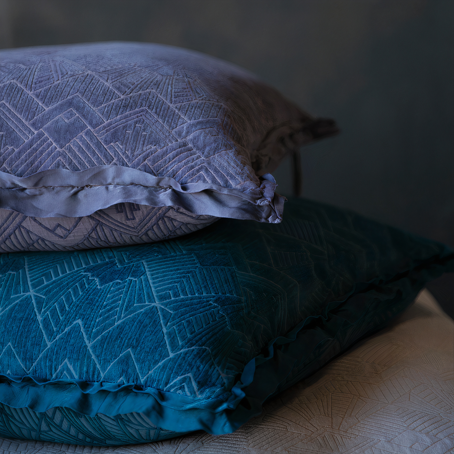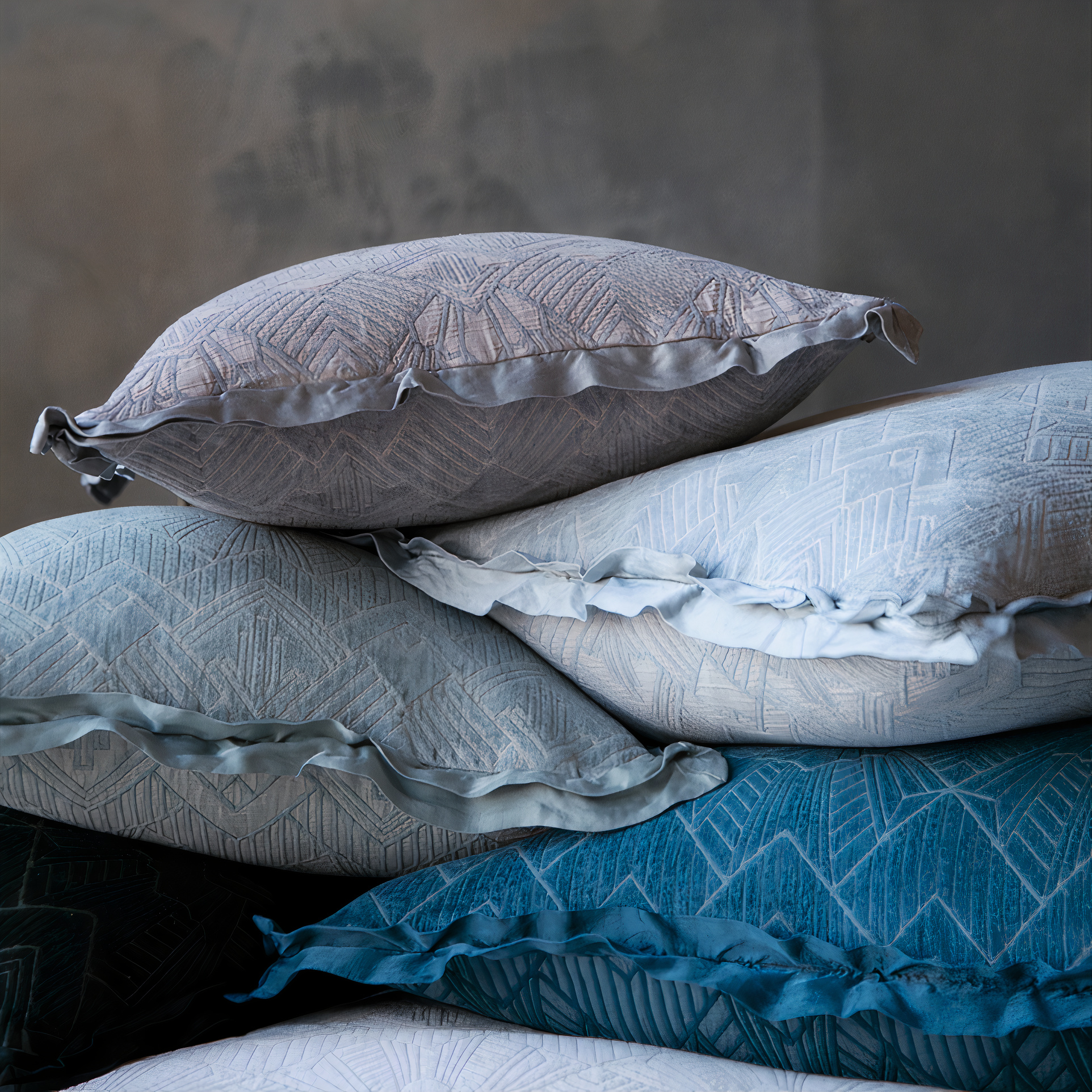 Standard 20" x 26", King 20" x 36", Euro 27" x 27, Deluxe 27" x 36”. Backed in Self, Knife Edge, Linen Tie Side Closure